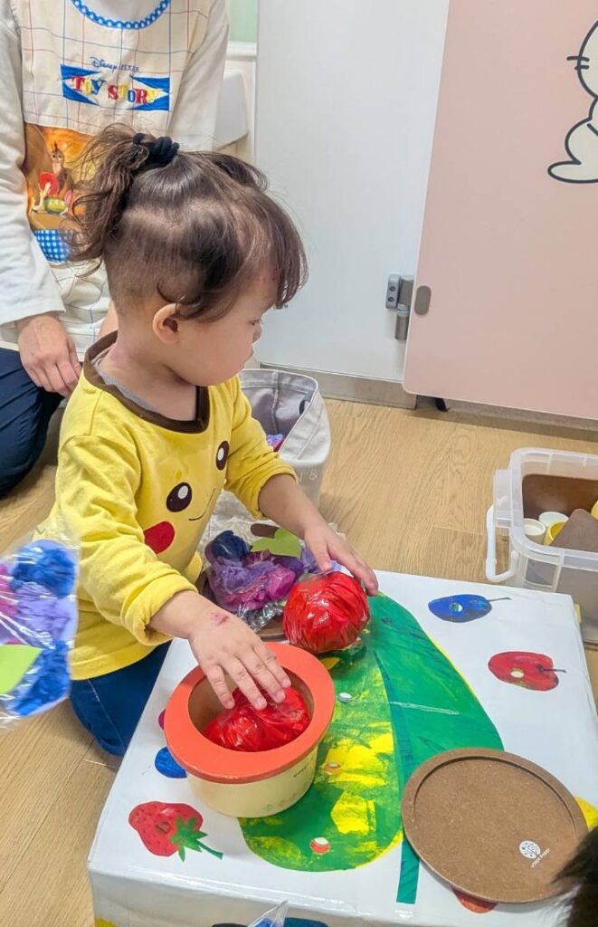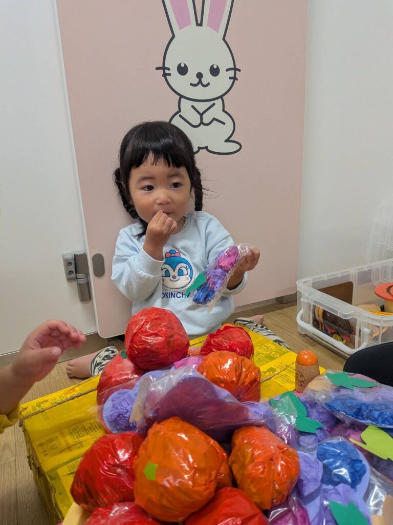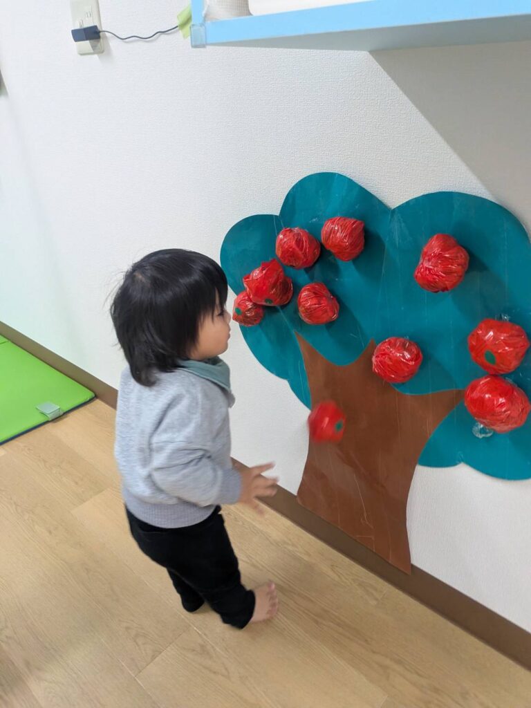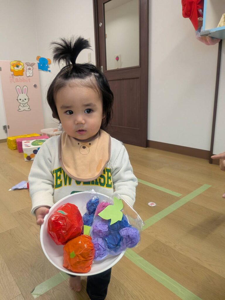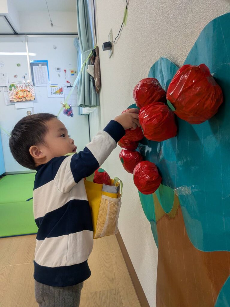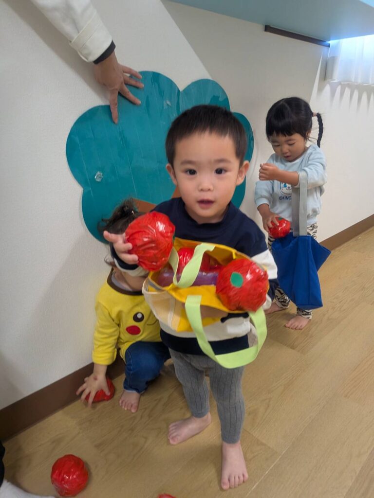 秋の楽しみの一つに、果物狩りがあります。家庭で経験している子どもたちもいるでしょうが、今日は、「わくわく果樹園」に足を運んだこあら組さん、ひよこ組さんです。みんなで果物も新聞紙や花紙を丸めて作りました。