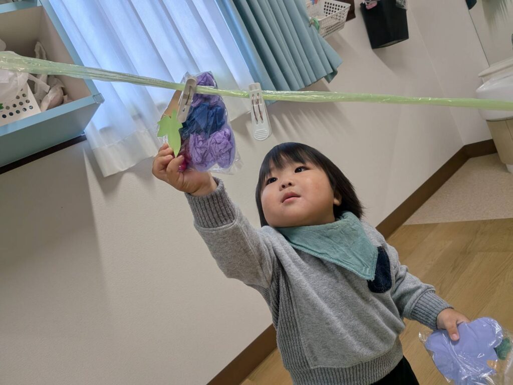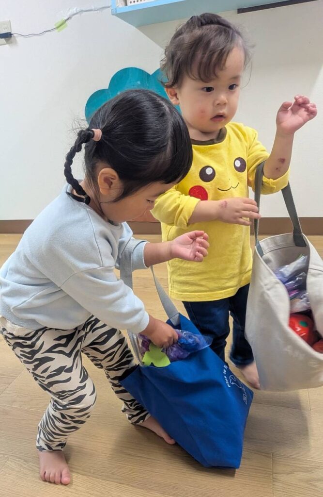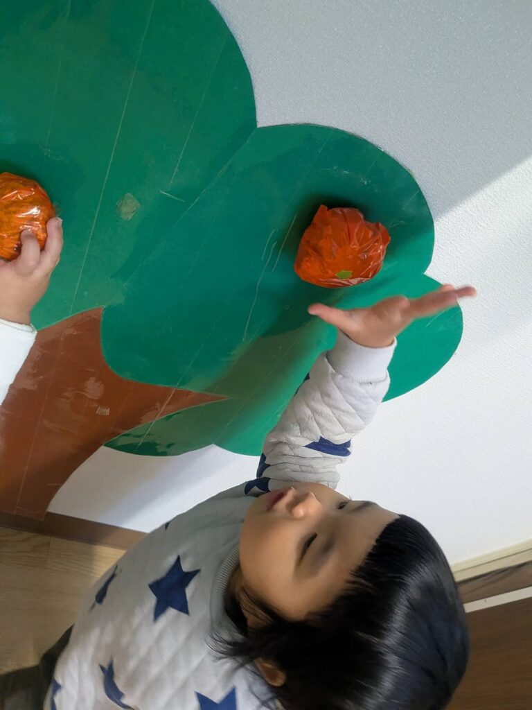 最近、心地よい気候が続き、ポカポカ陽気の中、二クラス合同で散歩に出かけています。この果物狩りもそんな散歩からでたアイディアでした。たわわになるみかんの木や柿の木を見て、美味しそうだね!とってみたいね!と始まりました。毎週、散歩を楽しみにしている、こあら組さん、ひよこ組さんです。