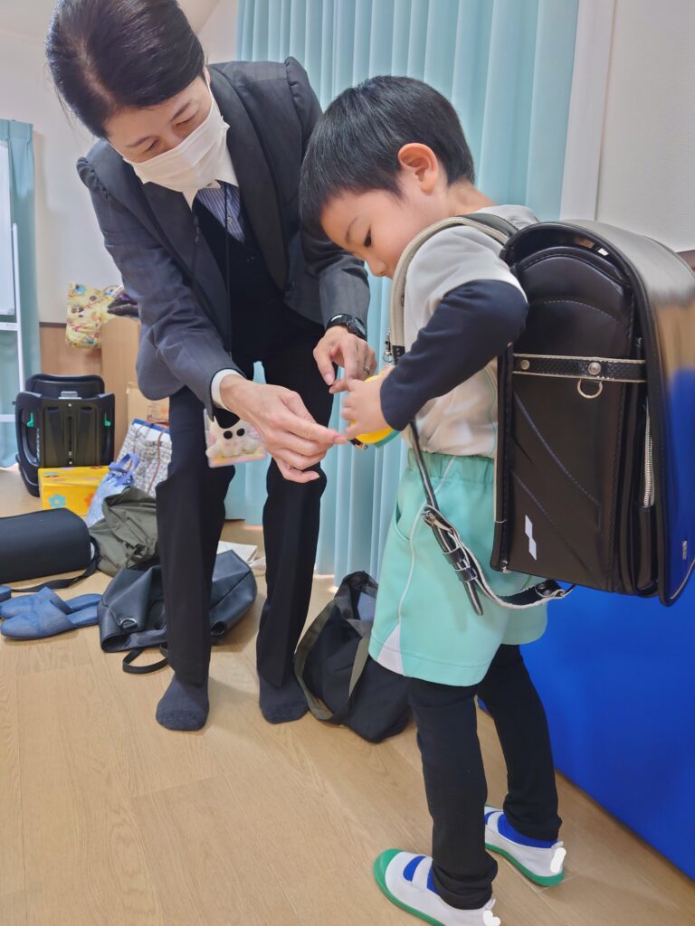 実際にランドセルを背負って一人ずつ練習させてもらいましたよ。