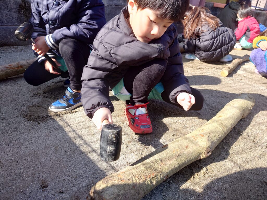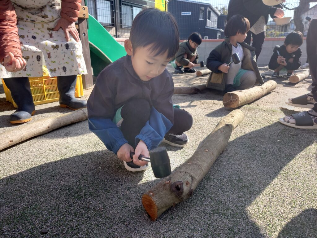 しいたけの種駒をハンマーで優しく木に打ち込んでいきます。