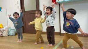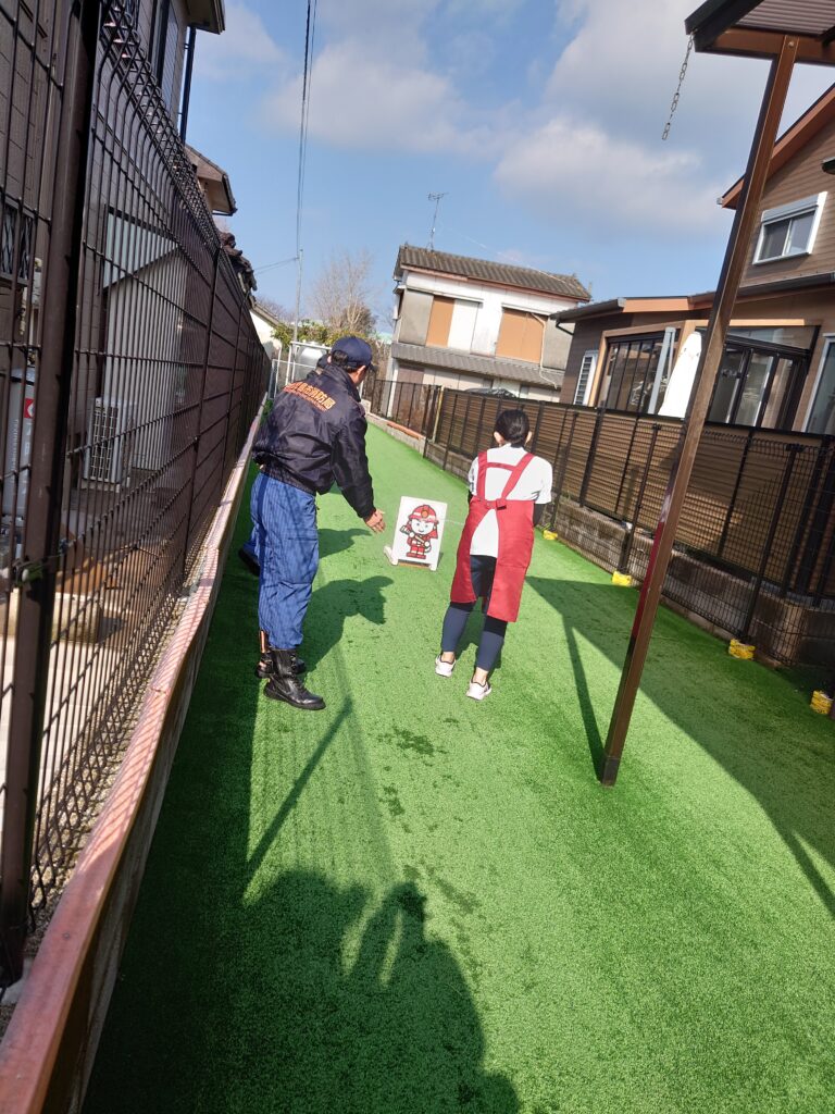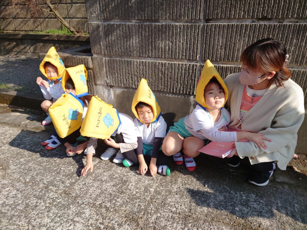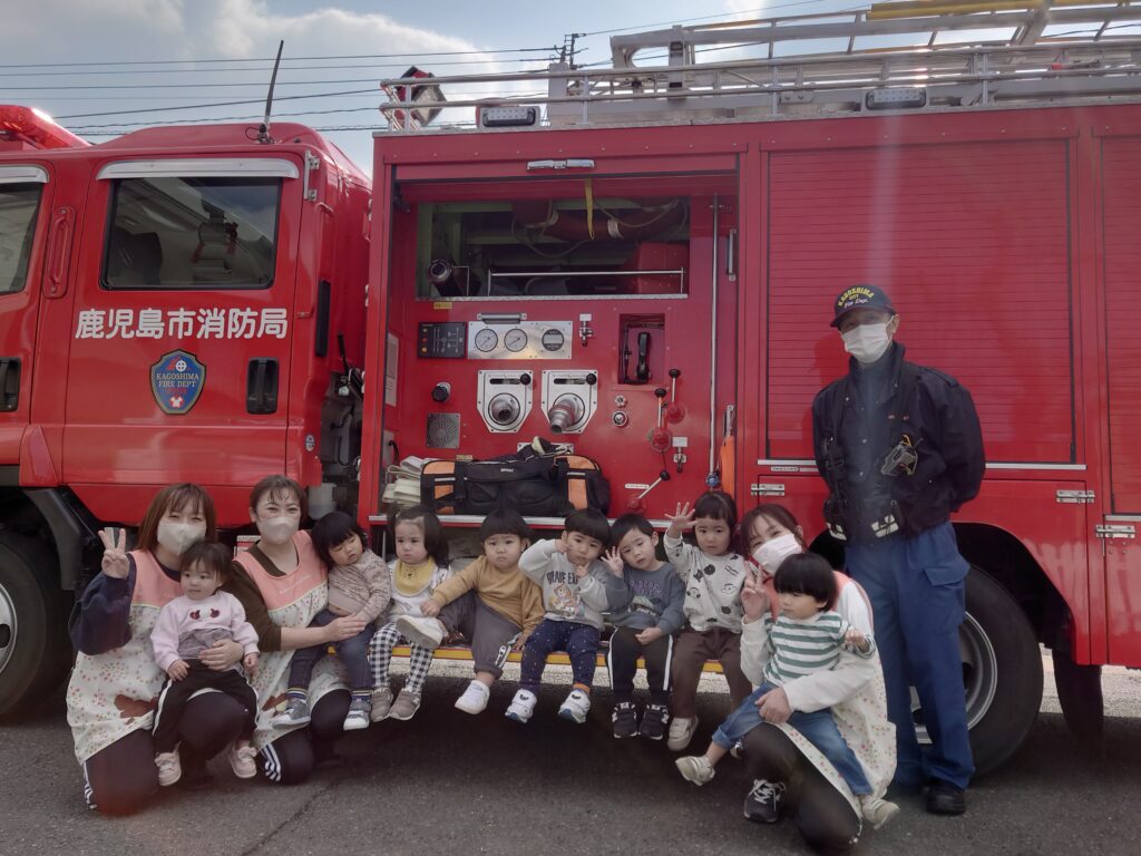 今日は消防士のお兄さんが来て、避難訓練をしたよ。非常ベルがジリジリ~ンとなると顔つきも真剣。いつもの通りいつもの通りと自分たちに言い聞かせながら避難を開始!